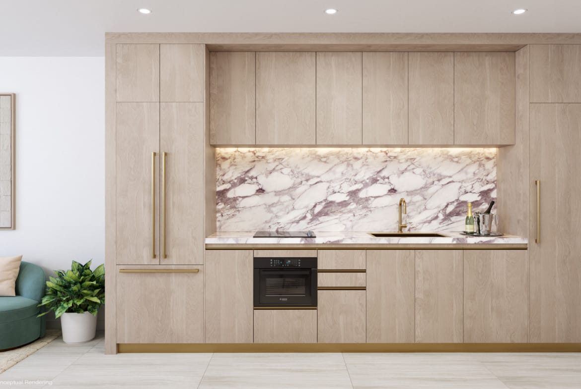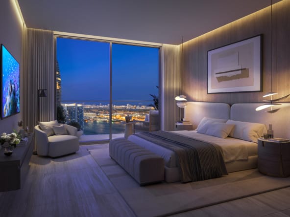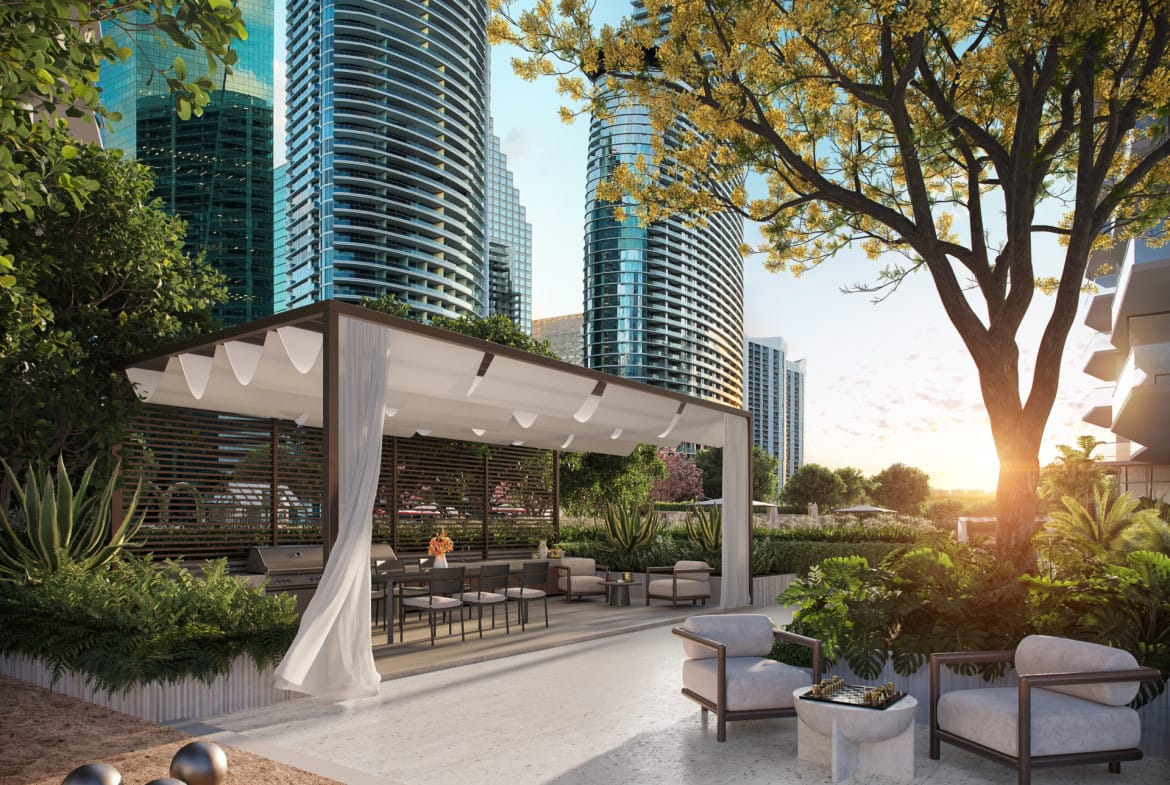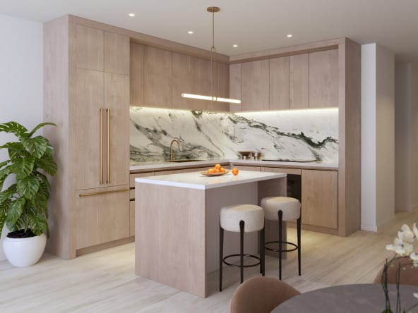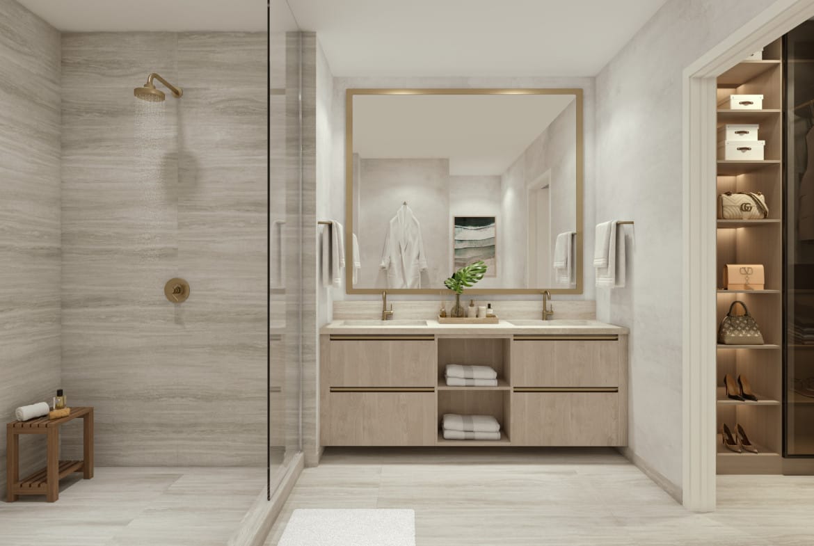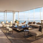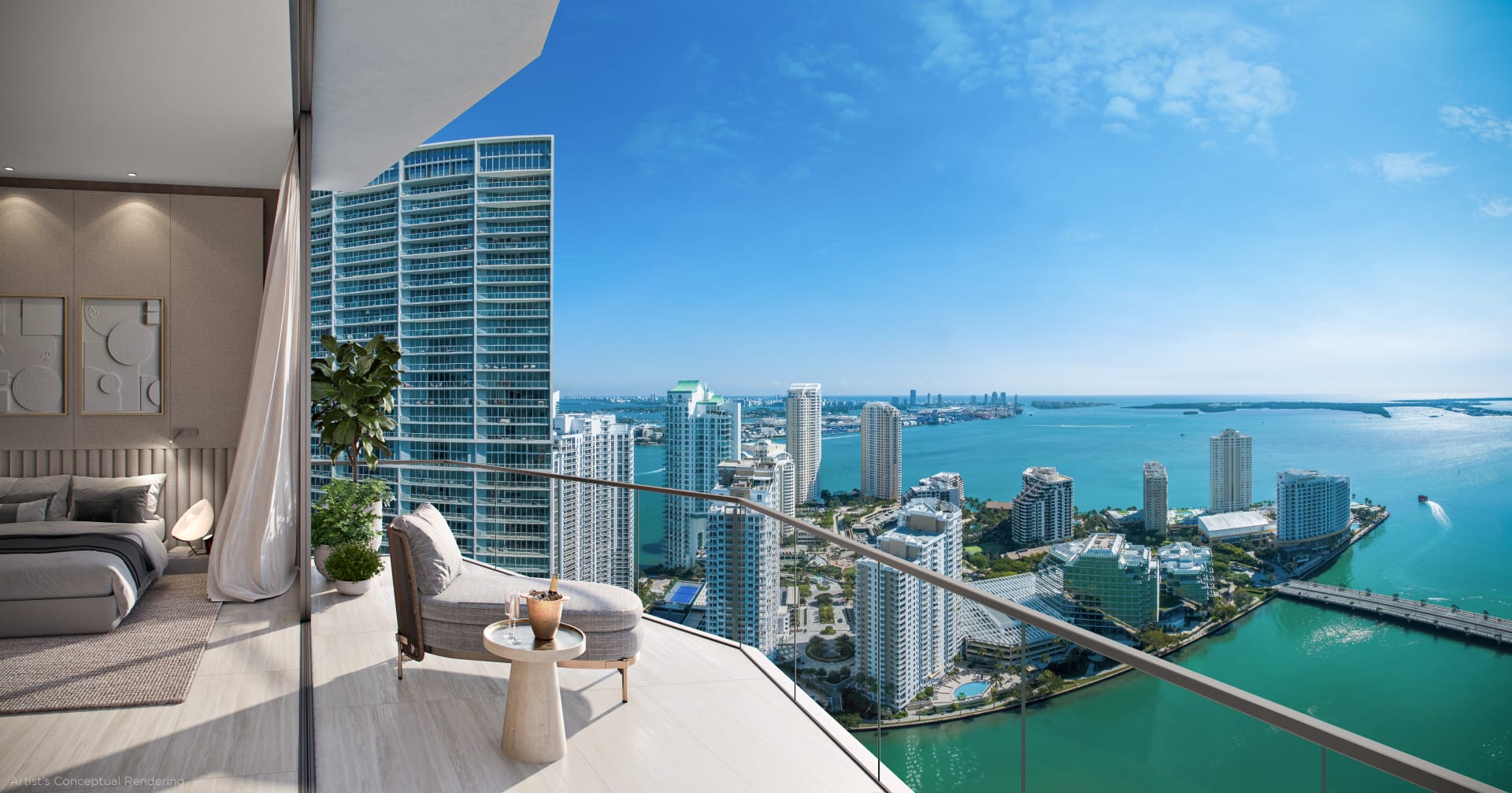 Each residence features floor-to-ceiling windows, Italian cabinetry, Bosch and Fisher & Paykel appliances, and imported travertine porcelain flooring, all complemented by panoramic views of Biscayne Bay and the Miami skyline.